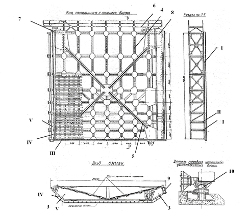 В первой главе проводится анализ современного состояния проблем прочности, усталости и трещиностойкости конструкций шлюзовых ворот судоходных гидротехнических сооружений каналов внутренних водных путей, который показывает, что надежная работа механического оборудования в значительной степени определяется несущей способностью элементов конструкций ворот (затворов). Дается подробное описание конструкций основных видов шлюзовых ворот СГТС (двустворчатые, откатные, сегментные). Однако, при этом отмечается, что двустворчатые ворота (ДВ) являются наиболее широко (более 80 %) применяемым типом затворов. ДВ представляют собой две многоригельные сварные створки с осями вращения в вериях (рис.1.). Основные элементы створки ДВ: металлическая обшивка (1), ригели (2), створный и вериальный столбы (3), диафрагмы (4), диагональные связи (5), служебный мостик (6), створный захват (7), гальсбант (8), упорные подушки (9) и пятовое устройство (10). Конструкционный материал- сталь М16С,09Г2С, ХСНД и др.