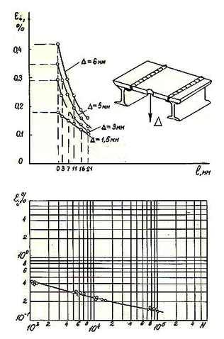 Во время испытаний был отмечен общий характер развития трещин под действием повторно - статической нагрузки. Все они начинали развиваться от подреза, сделанного сварным швом в основном металле. Место разрушения моделей находилось в средней части длинной стороны. Количество циклов нагружения, при которых появлялись поверхностные трещины и число циклов до образования сквозных разрушений приведены в 5-ти таблицах диссертации. Эти данные получены при испытании образцов шпаций, моделирующих технологию сварки внахлест, технологию сварки внахлест (первый ремонт без разделки трещины), технологию сварки внахлест (второй ремонт с разделкой трещин), технологию сварки встык и технологию сварки встык (первый ремонт без разделки трещины). На рис. 11 показаны данные об экспериментальных полях деформаций для рассматриваемой модели по параметру приложенного перемещения и кривые малоцикловой усталости данного образца.