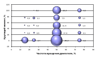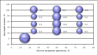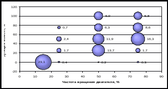 При проведении теоретического исследования принято, что распределение городского и магистрального режимов движения составляет 50%: 50%. Результаты расчетов представлены на рис. 9, на этом же рисунке представлены: диаграмма распределения режимов работы в соответствии с 13-тиступенчатым стационарным циклом ESC; режимы работы по протоколу цикла ETC (1800 точек) и диаграмма распределения этих режимов, приведенных к 13-тиступенчатому циклу Правил. Анализ полученных данных показывает, что имеется существенное сходство между распределением рабочих режимов двигателя автомобиля в смешанном ездовом цикле и в испытательном цикле ESC, что позволяет сделать вывод о правомерности использования цикла ESC, в соответствии с Правилами, для сертификационных испытаний бензиновых двигателей для АТС полной массой более 3,5 т.