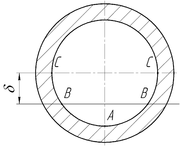 Из рисунка видно, что значения относительной деформации в нижней части фланца, прилегающей к точке А, значительно меньше, чем в верхней, причем разница эта, быстро возрастает с увеличением коэффициента трения. Очевидно, что изгибная деформация продольных волокон проставки в радиальных направлениях распределяется соответственно радиальной деформации фланца. Поэтому, если отметить точками В и С (рис. 40) положение горизонтальных (относительно точки А) диаметров центрующих поверхностей детали 2 и проставки 1, то в собранном соединении диаметр В будет расположен несколько ниже диаметра С, в то время как при равномерном распределении деформаций в собранном соединении оба эти диаметра совпадают. В работе, по мере выравнивания и перераспределения деформаций, диаметр В переместится вверх до полного совмещения с С на величину