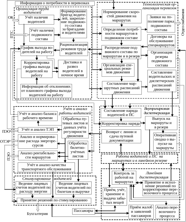 Рис. 5. ИЛМ организации перевозок пассажиров ГПТ (пунктирными контурами обозначены функциональные блоки задач, светлыми стрелками – основные информационные связи с подразделениями транспортной организации); ПС – подвижной состав; ПЭО – планово-экономический отдел; ОТЭР – отдел топливно-энергетичес-ких ресурсов; ОК – отдел кадров; ПТС – производственно-техническая служба