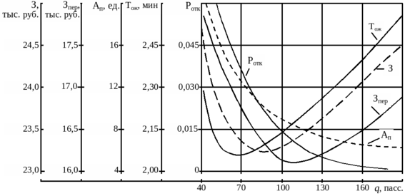 Предложенная модель выбора и распределения автобусов предусматривает индивидуализированное для маршрута определение числа и вместимости автобусов как одновременно оптимизируемых переменных, и позволяет в среднем на 8 % повысить качество перевозок при минимизации расходов. Выбор и распределение автобусов производятся технологом исходя из предлагаемых компьютером зависимостей (рис. 6).