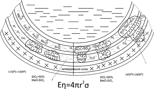 - кластеры окисного расплава представляют собой зону комплексных соединений, состоящую из силикатов различного состава;