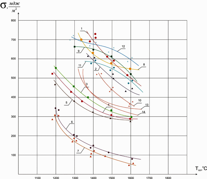 1 - расплав №1; 2 - расплав №2; 3 - расплав флюса АН-28; 4- расплав флюса АН-18; 5 - расплав флюса АНФ-14; 6 - расплав флюса АН-60; 7 - расплав №2; 8 - расплав SJ-1; 9 - расплав SJ-2; 10 - расплав №1 (метод давления в газовом пузырьке); 11 - расплав SJ-1(метод давления в газовом пузырьке); 12 - расплав SJ-2 (метод давления в газовом пузырьке); 13 - флюс АН-348А; 14 - флюс ОСЦ-45;