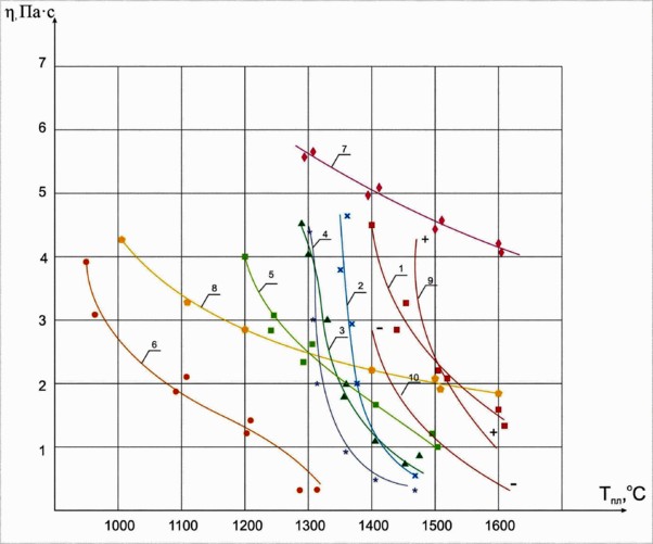 Рис.8. Вязкость шлаковых расплавов формирующих подкладных устройств
