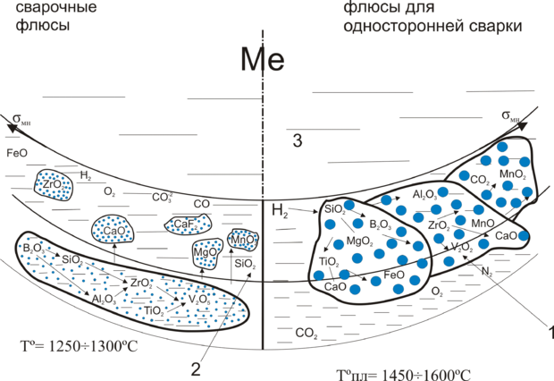сделать оптимальный выбор, как шлаковой системы подложки, так и соотнесенную с ней шлаковую систему верхнего флюса, покрытия или шихты. Учитывая скоротечность взаимодействия металлической и шлаковой фазы в корне шва и отсутствие влияния флюса на стадии капли, следует сделать вывод, что при высокой химической активности корневой шлаковой системы, верхний флюс должен быть малоактивным при сохранении стандартных сварочно-технологических свойств шва в процессе сварки углеродистых и низколегированных сталей.