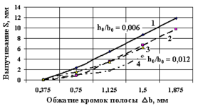 Получили зависимости величины выпучивания прокатываемых полос от абсолютного обжатия их кромок, некоторые из которых приведены на рис. 5.