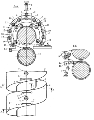 1 – верхний валок, 2 – кожух, 3 – приводные ролики, 4 – тяги, 5 – коромысла, 6 – ось, 7 – пневмоцилиндр, 8 – ось, 9 – датчик, 10 – промежуточные гибкие элементы, 11 – пары транспортирующих роликов, 12 – непривоные ролики, 13 – направляющие, 14 – отсекатель, 15 – нижний валок, 16 – заслонка, 17 – пневмо-цилиндр