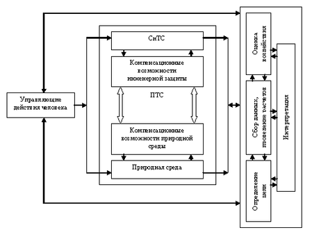 Анализ этой модели показывает, что геоэкологическая безопасность ПТС зависит от показателей состояния СиТС, уровня инженерной защиты, компенсационных возможностей природной среды, показателей состояния природной среды. Отсюда можно сделать вывод о том, что возможны два способа управления геоэкологической безопасностью ПТС: геоинформационный (на основе анализа показателей состояния объектов природной среды и их компенсационных возможностей) и технический (на основе анализа экологических показателей СиТС и уровня инженерной защиты). Технический способ управления по предложению ряда авторов (В.А. Грачев, В.В. Гутенев, В.М. Котляков, А.Л. Ревзон и др.) предполагает регулирование режима функционирования системы в зависимости от характера и степени динамической природной составляющей, несущей способности оснований сооружений и состояния (надежности) технической составляющей.