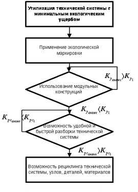 Для управления экологическим проектированием разработаны политика, цели и программа повышения геоэкологической безопасности ТС. Программа может быть представлена и в алгоритмах (например, алгоритм для снижения негативного воздействия при рециклинге представлен на рис. 6).