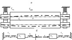 велся в предположении, что податливость цилиндров сосредоточена в цапфах. Это позволяет представить печатный аппарат из двух цилиндров (рис. 6а) в виде двухмассовой системы (рис. 6б).