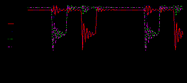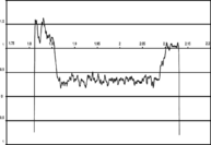 Колебания цилиндра становятся хорошо заметны при сопоставлении показаний датчика на большой и малой скорости. На рис. 15 показаны фрагменты осциллограммы, соответствующие окончанию печати, отсутствию натиска и началу печати.