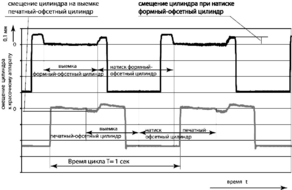 Экспериментальное определение смещений цилиндра в динамике проводилось для формного цилиндра машины Romayor 314. Усилие печати устанавливалось за счет изменения толщины прокладок под офсетную резину.