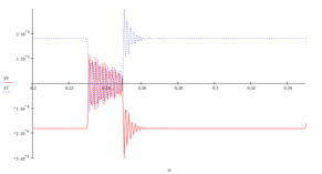 Численное решение этой системы (рис. 9), проведенное по той же методике, что и для 2-массовой системы, показало влияние прохождения выемки в одной из зон контакта на деформации декеля в другой зоне.