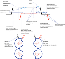 Так как выемка формного цилиндра машины Romayor велика (по углу достигает 140), зафиксировать прохождение обоих краев выемки одним датчиком не представлялось возможным, поэтому датчики были смещены пор углу поворота цилиндра так, что один фиксировал начало печати, а второй окончание печати (рис. 13).