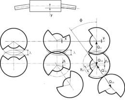 y0 – прогиб первого (формного) цилиндра; y21 – прогиб второго (офсетного) цилиндра в направлении первого, y23 – прогиб второго цилиндра в направлении третьего (печатного);