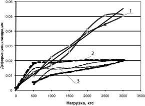 Зависимости деформации от нагрузки приведены на рис. 11, на котором по горизонтали отложена нагрузка в кгс, по вертикали – деформации (в мм) цилиндра по краям и в середине.