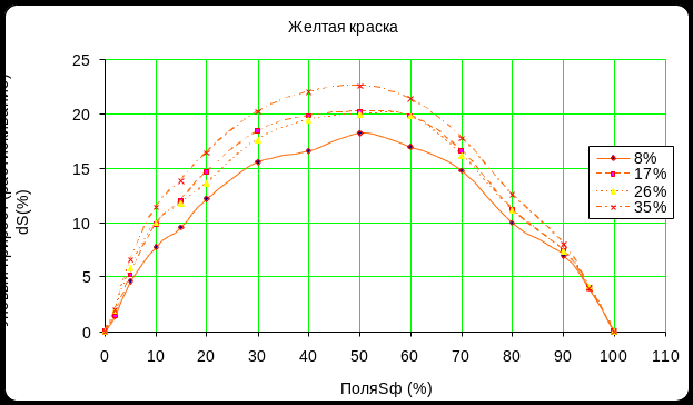 Таким образом, экспериментально показано, что тоновый прирост в зависимости от количества подаваемой краски может изменяться на 4,4%, от изменения температуры формного цилиндра в интервале от 17 до 27 оС - на 3,2%, от производительности процесса в интервале от 5500 до 9500 отт./час - на 2,6% и от изменения давления между офсетными и печатными цилиндрами в интервале от 17,6 до 114,4 Н/см2 – 2%.