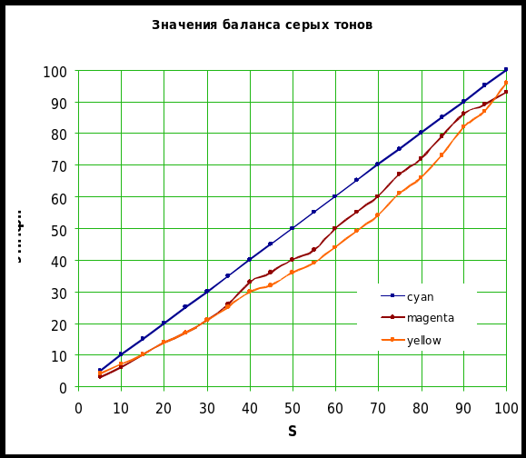 С использованием разработанной программы можно построить значения баланса серых тонов для 3-х красок по всей протяженности тоновых полей. (Рис. 9). Этот баланс может быть использован на том оборудовании и материалах, для которых был рассчитан баланс «по серому».