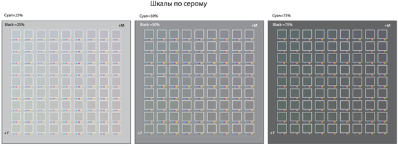 Также, шкала БСТ, с разными процентными соотношениями триадных цветов для определения баланса серого программным продуктом с помощью спектросканера. (рис.4)
