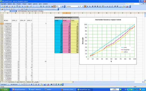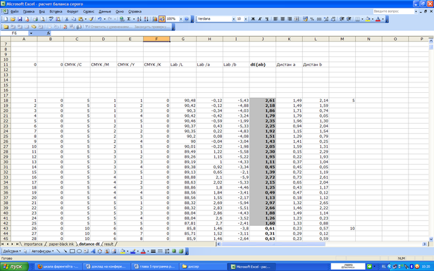 на листе "distance dE" вычисляется ∆E, полутонового поля CMY от виртуального (расчетного) полутонового поля K. Здесь в колонке J вычисляется дельта ab для всех значений. (рис. 7)