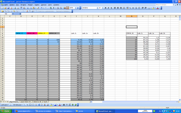 Рис. 8. Вид листа "result" для получения значений баланса серых тонов