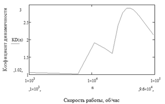 Рис. 5. Изменение коэффициента динамичности с изменением скорости при прохождении накатным валиком с собственной частотой 140Гц цилиндра диаметром 250 мм и длинной выемки 10 мм, шириной зоны контакта 5мм