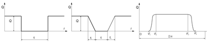 Нагрузка при взаимодействии валика и формного цилиндра может рассматриваться как меняющаяся мгновенно (рис. 4а) только при большой скорости работы машины. Более близким к реальности является предположение о линейном законе нарастания усилия за время τ (рис. 4б), равном отношению ширины зоны контакта к окружной скорости формного цилиндра. Дальнейшее приближение к фактическому характеру нагружения может быть получено при учете характера нарастания нагрузки про вхождении края выемки в зону контакта формного цилиндра и накатного валика (рис. 4в).