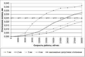 Рис. 8. Отклонения накатного валика от стационарного положения в зависимости от скорости работы машины и толщины стенок сердечника накатного валика