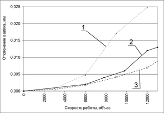 Рис 13. График отклонения накатного валика на разных скоростях работы печатной машины; 1 – теоретическая зависимость (толщина стенки сердечника валика 1 мм); 2 –экспериментальная зависимость (толщина стенки 2 мм); 3 – теоретическая зависимость (толщина стенки сердечника валика 2 мм)