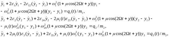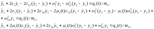 Рассматриваемая трехмассовая динамическая модель печатного аппарата ПМ (рис.11) позволяет исследовать влияние размеров технологических выемок цилиндров, числа оборотов и сил натиска на характер динамических процессов. Если в систему уравнений (10) ввести параметрические слагаемые, которые появляются в результате периодического изменения изгибной жесткости цилиндров при их вращении, то она примет вид