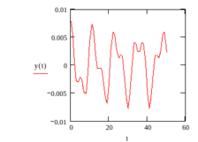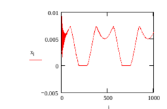 внешней нагрузке стремится к постоянной величине (рис.2 ). Наличие выемки существенно меняет характер колебательного процесса. После переходных процессов в системе устанавливаются колебания, обусловленные периодическим изменением изгибной жесткости цилиндра, частота которых зависит от скорости вращения (рис.3).