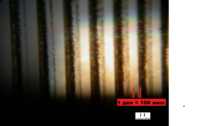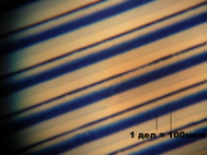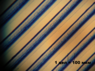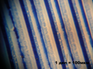 Рисунок 7 – Микрофотографии отпечатков, сделанных водно-дисперсионной краской на пленках из ПП, обработанных коронным разрядом при D = 12 Вт·мин/м2 (вертикальные штрихи – а, наклонные штрихи – б). Масштаб – 1 дел. – 100 мкм