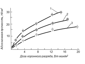 Анализируя результаты проведенных исследований, не трудно заметить, что режимы обработки существенно влияют на адгезионную прочность на границе печатная краска – полимерная пленка. Причем, меняя продолжительность обработки коронным разрядом (скорость транспортирования пленки), напряжение разряда, ток коронного разряда, изменяется и эффект от обработки, выраженный изменением гидрофильности, микрогеометрии поверхности и ее адгезионной способности. При этом, изменяя ширину обрабатываемого материала, будет изменяться и достигаемый эффект. Поэтому характеризовать процесс обработки коронным разрядом через указанные выше параметры не совсем удобно и правильно. Здесь необходимо отметить, что эффект от обработки коронным разрядом будет зависеть от дозы облучения, полученной поверхностью полимерной пленки: