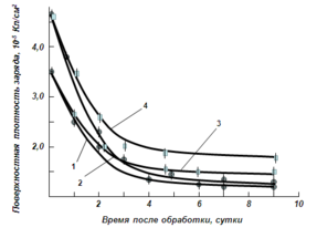 Изучая кинетику снижения плотности электрического заряда, индуцированного на поверхности полимерных пленок, подвергнутых обработке коронным разрядом, можно отметить, что наиболее высокая плотность поверхностного заряда, при одинаковых условиях обработки, наблюдается у пленок из ПЭТФ и ПП, однако на пленках из ПП релаксация поверхностного заряда во времени происходит более интенсивно.