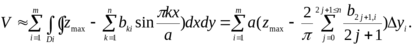 В сечении у = уi, i = 1, 2 ,…, m1 уравнение профиля комбинированного материала можно задать согласно [4] в виде многочлена Фурье. Красочный слой рассматривается как тело, ограниченное вертикальными плоскостями х = 0, х = а, у = уi -1, у = уi, сверху частью плоскости, имеющей уравнение z = zmax, где zmax – максимальная высота красочного слоя, найденная для всего образца, снизу цилиндрической поверхностью с направляющей