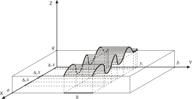 Образец запечатанного комбинированного материала разбивается плоскостями у = уi, i = 1, 2,…, m1, параллельными координатной плоскости XOZ c шагом h. Тогда красочный слой разбивается на m частей, причем объем всего красочного слоя V равен сумме объемов малых красочных слоев: