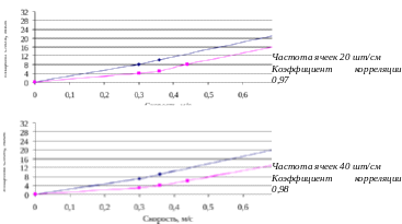 Исследование деформации упругой оболочки под давлением проводили методом нагружения. Для проведения исследований, были изготовлены опытные образцы упругой оболочки, изготовленные из резины и фотополимера. Частота расположения ячеек составляла 20 и 40 шт/см. Полученные зависимости, показаны на рис. 5.
