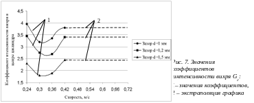 В результате анализа значений ГДД было установлено, что для всего диапазона регулирования значение интенсивности вихря, моделирующего вращение краски можно принять равным G1=0,02. Значения ГДД, полученные в ходе натурного эксперимента позволили определить коэффициенты интенсивности вихря G2, моделирующего вращение цилиндра, при которых отклонения в расчетном способе по отношению к экспериментальному не превышало 4%. Значения коэффициентов показаны на рис. 7.