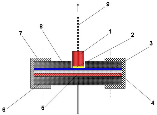 Рис.1. Конструкция ячейки для количественной оценки адгезионной прочности методом нормального отрыва, где: 1 – «грибок», 2 – слой клея, 3 – печатная краска, 4 – полимерная пленка, 5 – декель, 6 – нижняя металлическая пластинка, 7 – струбцина, 8 – прижимная пластина, 9 – гибкое соединение.