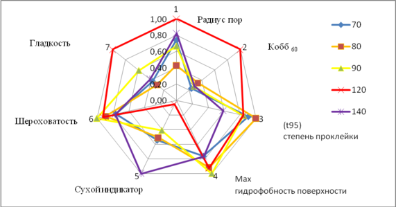 Рис. 3. Диаграмма, показывающая различия в показателях поверхностных и сорбционных свойств бумаги.