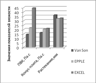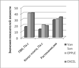 В работе для определения вязкости красок использовали стержневой вискозиметр ПВК и конический вискозиметр Реотест RV20 (HAAKE), работающий по принципу «конус-плита», а также определялся показатель условной вязкости - растекание на стекле. На рисунке 4 редставлены диаграммы сравнения показателей вязкости, измеренные различными методами, для голубой и пурпурной краски.