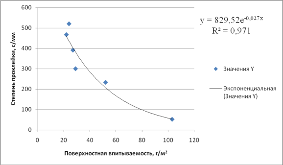 Рис.2. График корреляционной зависимости между показателями степени проклейки по методу «сухого индикатора» и поверхностной впитываемости по методу Кобба