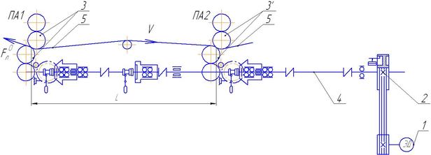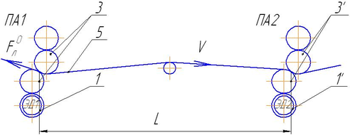 На рис. 1 а печатные пары (ПП) 3, 3 связаны помимо бумажной ленты 5 ещё и участком горизонтального вала 4, выполняющим роль синхронизатора возникающих рассогласований. Его динамическая жёсткость назначается из условия, чтобы при максимальном рассогласовании ПП неприводка печати не превышала технологически допустимой величины. Поэтому необходимости в дополнительном управлении неприводкой здесь не возникает. К тому же динамика этого варианта привода изучена достаточно подробно и теоретически, и экспериментально.