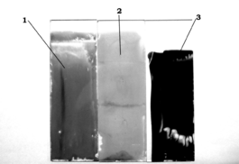 Рисунок 5 - Образцы с токопроводящей композицией №3 без обработки (1) и после обработки аргоном (2) и кислородом (3)