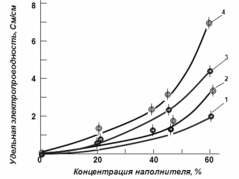 Рисунок 10 - Зависимости удельной электропроводности от концентрации чешуек графена – 1 и углеродных нанотрубок – 2 в поливиниловом спирте и чешуек графена – 3 и нанотрубок – 4 в полианилине.