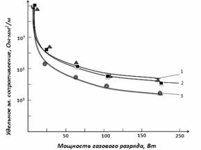 Исследуя влияние параметров плазмохимической обработки в среде аргона на поверхностное электрическое сопротивление, в работе было установлено, что с увеличением мощности разряда при плазмохимической обработке величина электрического сопротивления снижается, при этом увеличение концентрации аргона в камере обработки отрицательно сказывается на эффекте снижения электрического сопротивления. Это подтверждается результатами, представленными на рис.7.