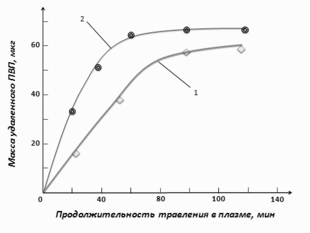Рисунок 4 - Зависимости массы вытравленного поливинилпирролидона от времени травления плазмой аргона (1) и кислорода (2)