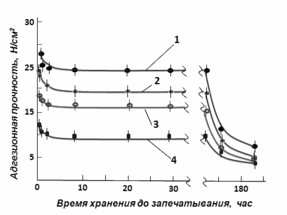 Исследуя зависимости адгезионной прочности от режимов активации поверхности полимерных пленок и времени выдерживания образцов пленок до нанесения электропроводящих композиций, в работе было установлено, что адгезионная прочность, независимо от режимов активации, сильно зависит от продолжительности хранения. Это хорошо видно из результатов, представленных на рис.3.