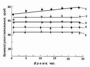 Рисунок 2 - Зависимости краевого угла смачивания водой поверхности пленок из ПЭТФ от продолжительности хранения образцов после обработки плазмой: 1 - аргона 5 мин , 2 – аргона 3 мин, 3 – аргона 30 с, 3 – кислорода 3 мин, 5 – кислорода 30 с.